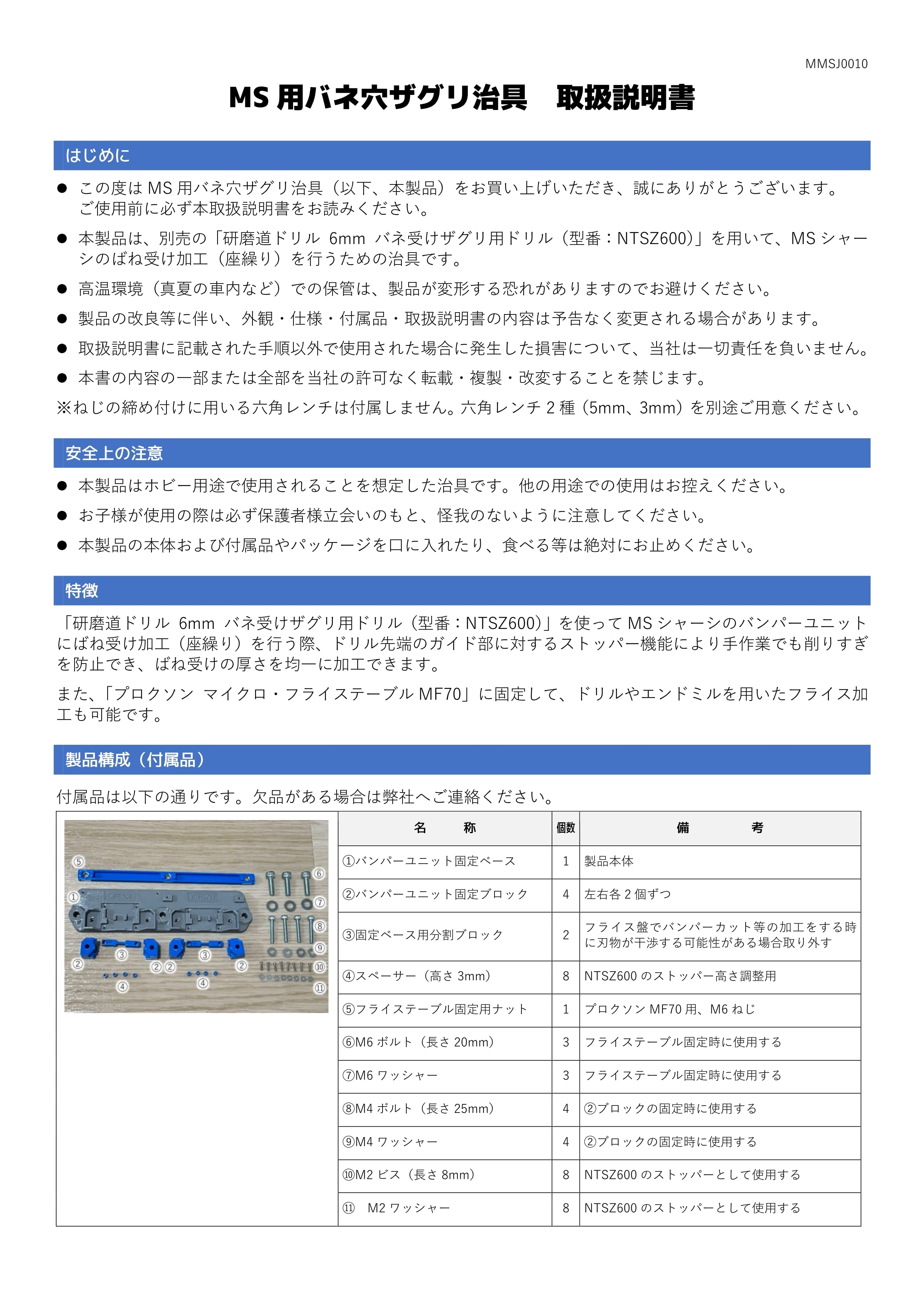 本製品は、別売の「研磨道ドリル 6mm バネ受けザグリ用ドリル(型番:NTSZ600)」を用いて、MSシャーシのばね受け加工(座繰り)を行うための治具です。
